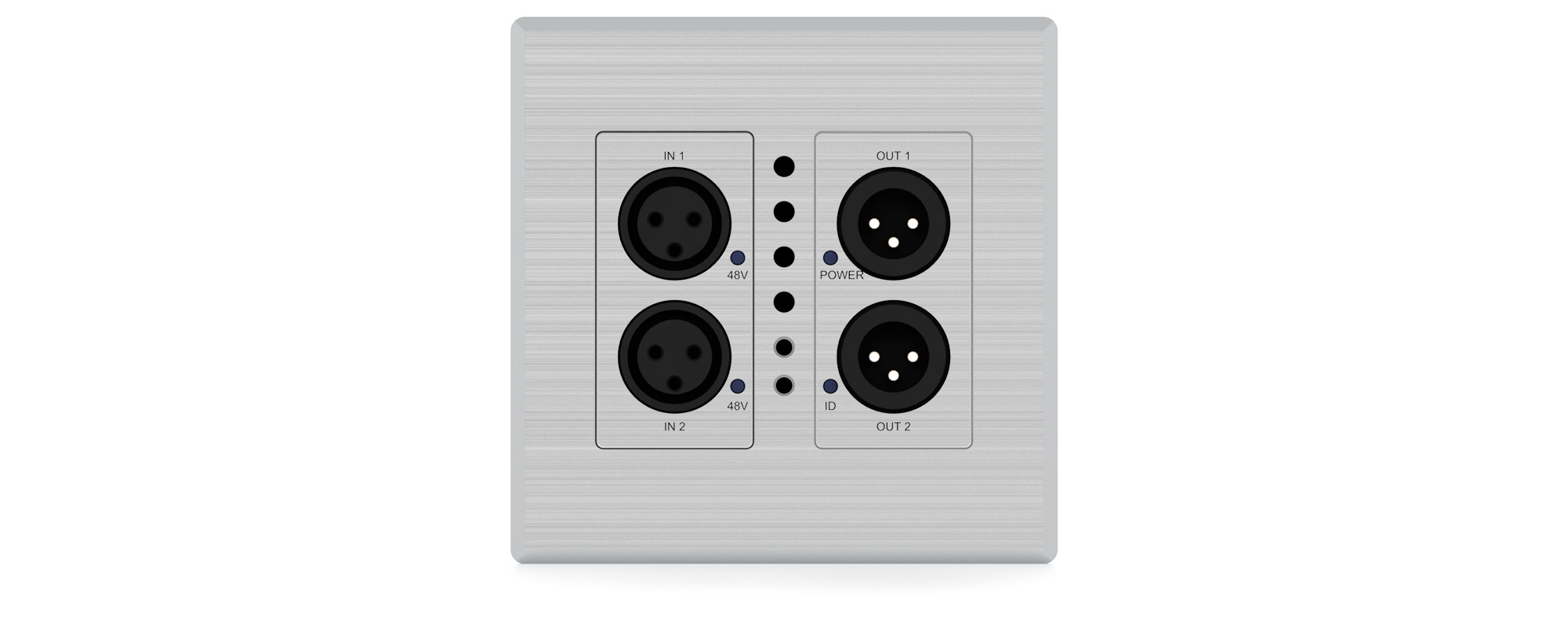 • Dante® network wall plate interface for 2 x audio inputs and 2 x audio outputs