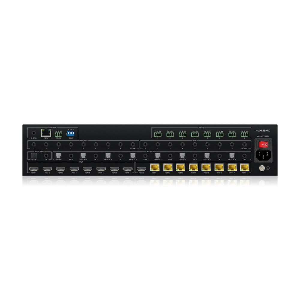 The HMXL88ARC HDBaseT™ Matrix delivers new levels of advanced audio integration into our Essential range of 4K video matrix solutions. The HMXL88ARC is an 8x8 HDMI 2.0 4K 60Hz 4:4:4 matrix that uses CSC (Colour Space Conversion) technology to deliver 18Gbps HDMI over distances of up to 40m (1080p to 70m).
